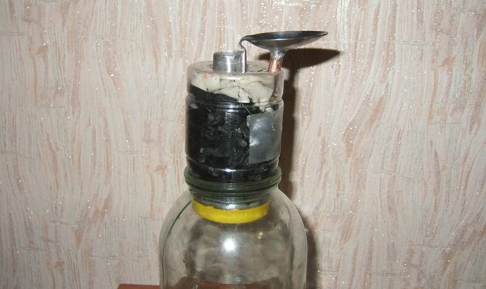 Можно изготовить своеобразную угольную колонну. Для этого потребуются две ёмкости, обычно бутылка и банка. Так как пластик для операций с алкоголем использовать не рекомендуется, лучше взять стекло или керамику. У бутылки нужно срезать дно (например, стеклорезом) и в перевёрнутом виде установить в горлышко банки. В бутылку засыпать кокосовый уголь для очистки самогона из расчета 12-15 грамм на литр. Горлышко бутылки прокладывается ватными дисками для предупреждения просыпания угля в банку. Самогон через фильтр следует проливать с небольшой скоростью.