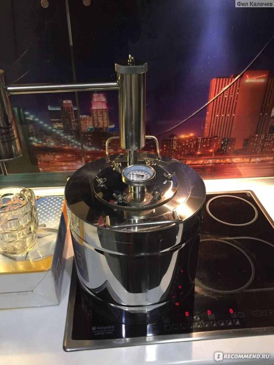 Куб оснащён электрическим , а вот на сухопарник повесили уже биметаллический градусник. Удобнее, конечно, работать с цифровым или электрическим, но хотя бы что-то. Толщина дна и стенок 2 и 1,5 мм соответственно. Работать можно на любых видах плитах. Для наглядности рекомендую вам посмотреть обзор от Сани Самогонова, где автор перечислил основные характеристики и тонкости этого «зверя». Если вы задумываетесь о покупке, то обязательно его посмотрите.