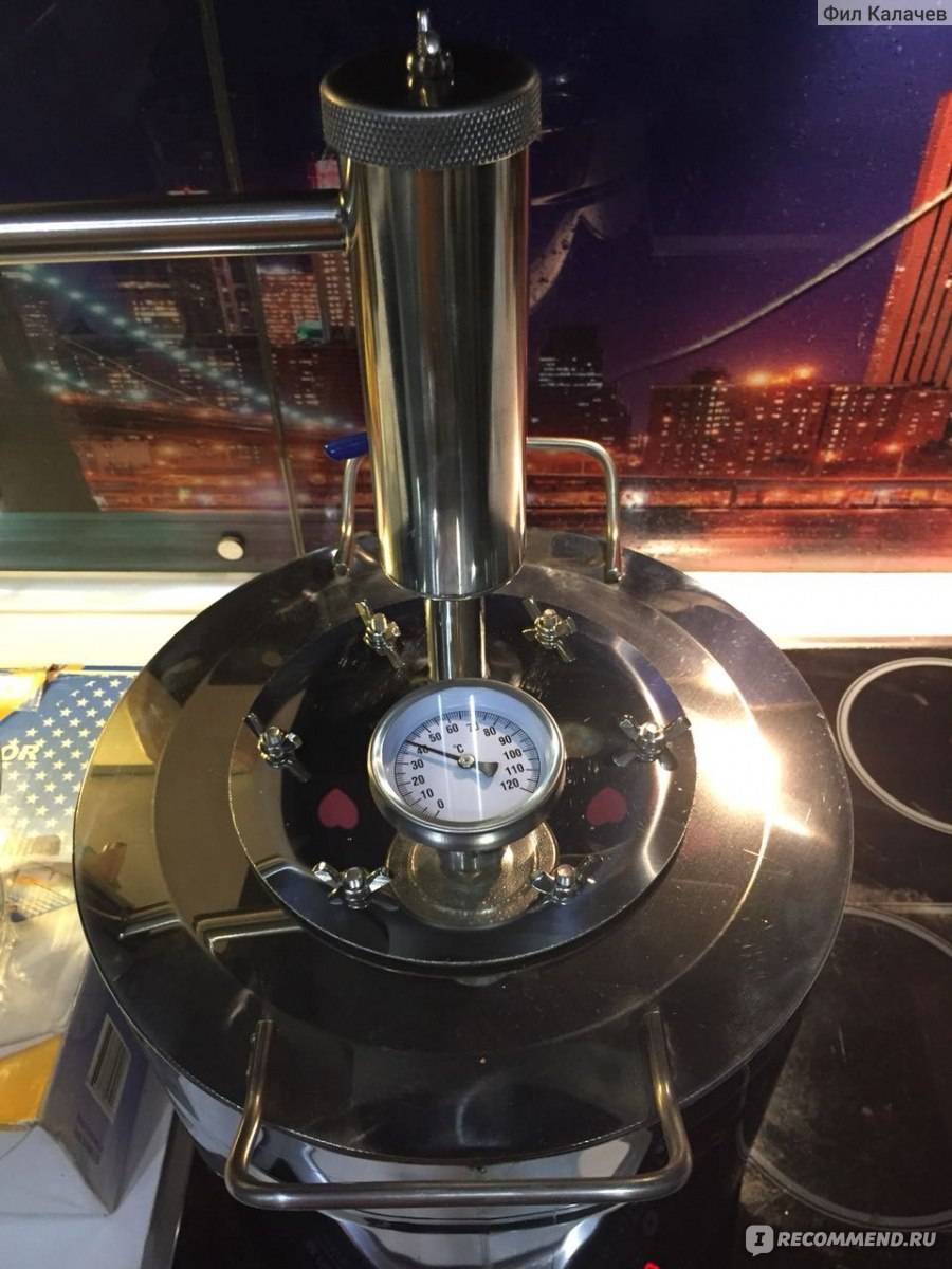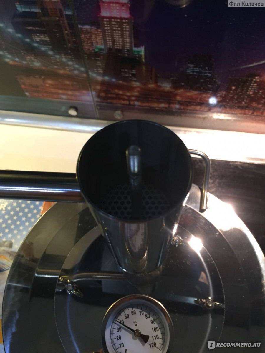 Еще один момент одновременно и удобен, и нет. Это термометр. С одной стороны он облегчает контроль процесса, дает расширенное представление о том, что происходит в конкретный момент времени, но с другой стороны расположен он не очень удобно – он смотрит вверх, и постоянно приходится наклоняться над кубом, чтобы увидеть температуру. Было бы удобнее, если бы он был врезан сбоку или просто смотрел в сторону самогонщика, а не в потолок. Но, в принципе, это мелочь, с которой можно жить.