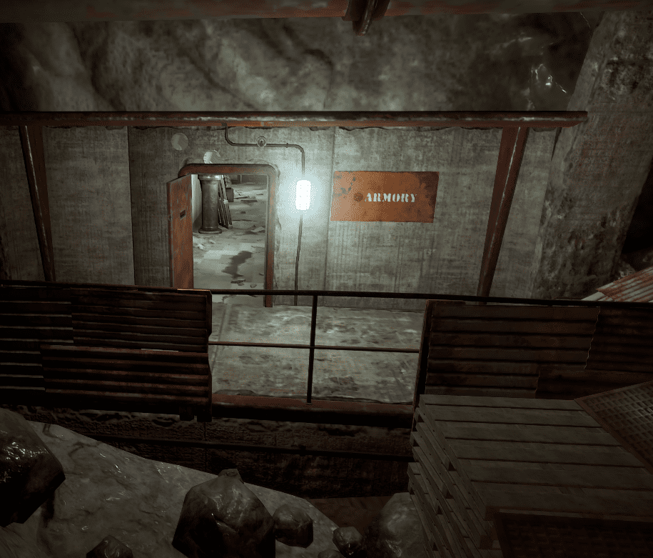 Вход в туннель надёжно охраняется учёными. Без оружия вы вряд ли подойдёте хотя бы близко к входу. Пройдя через оборону, вы попадаете в сам военный туннель. В нём довольно темно, так что возьмите на своё оружие . Туннель просто кишит учёными, так что будьте начеку. После входа вы увидите развилку. Повернув на право, вы увидите дверь в арсенал. Открыв эту дверь, вы увидите небольшой коридор. Переднюю дверь открыть не получится, а та, что справа откроется легко. Внутри вас будет ждать учёный, а так же пара ящиков.