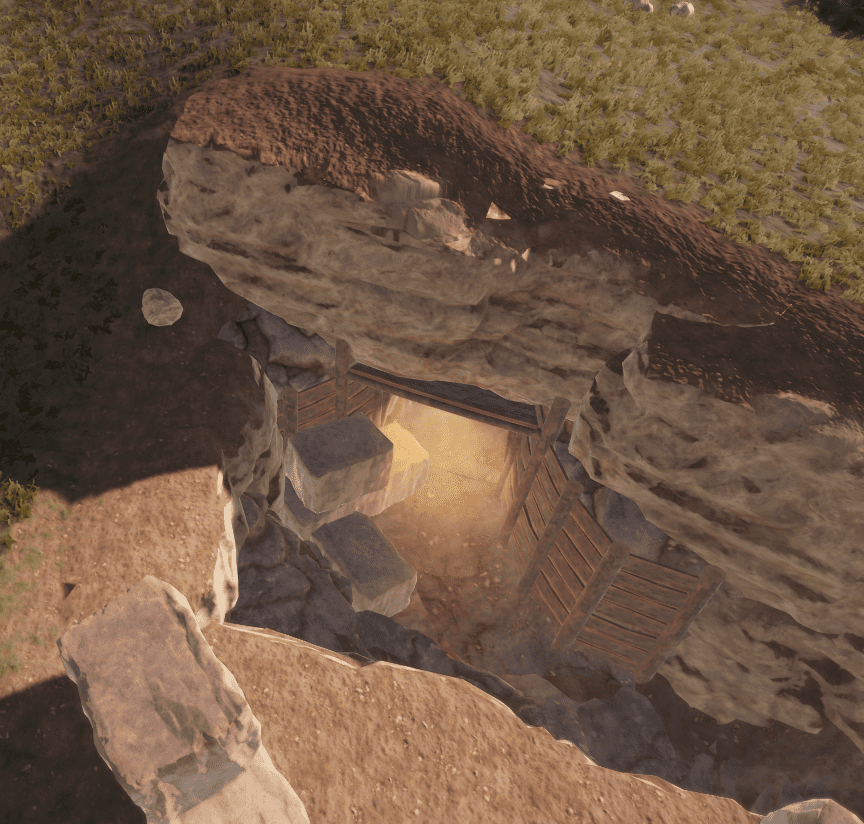- Второй туннель находится левее от входа в военный туннель. В нём уже можно найти как камни, так и бочки с компонентами, а также военные ящики.