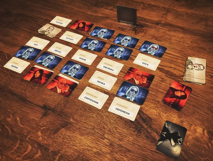 «Кодовые имена». На столе выкладывается квадрат 5×5 из карточек со словами, и игроки делятся на две команды. Капитаны команд должны с помощью коротких ассоциаций подсказать часть выложенных слов своим соратникам — раньше, чем соперники отгадают свои. Ошибки и неточности передают ход другой стороне.