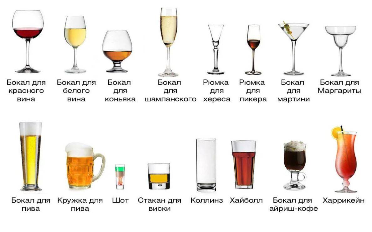 Существует огромное количество разновидностей, названий бокалов, но у каждого есть свое назначение. В фужерах подают шампанское, в рюмочках — ликер, в стаканах — воду, коктейли. Соблюдение правил по использованию посуды способствует наиболее полному раскрытию вкусовых и ароматических свойств напитков.