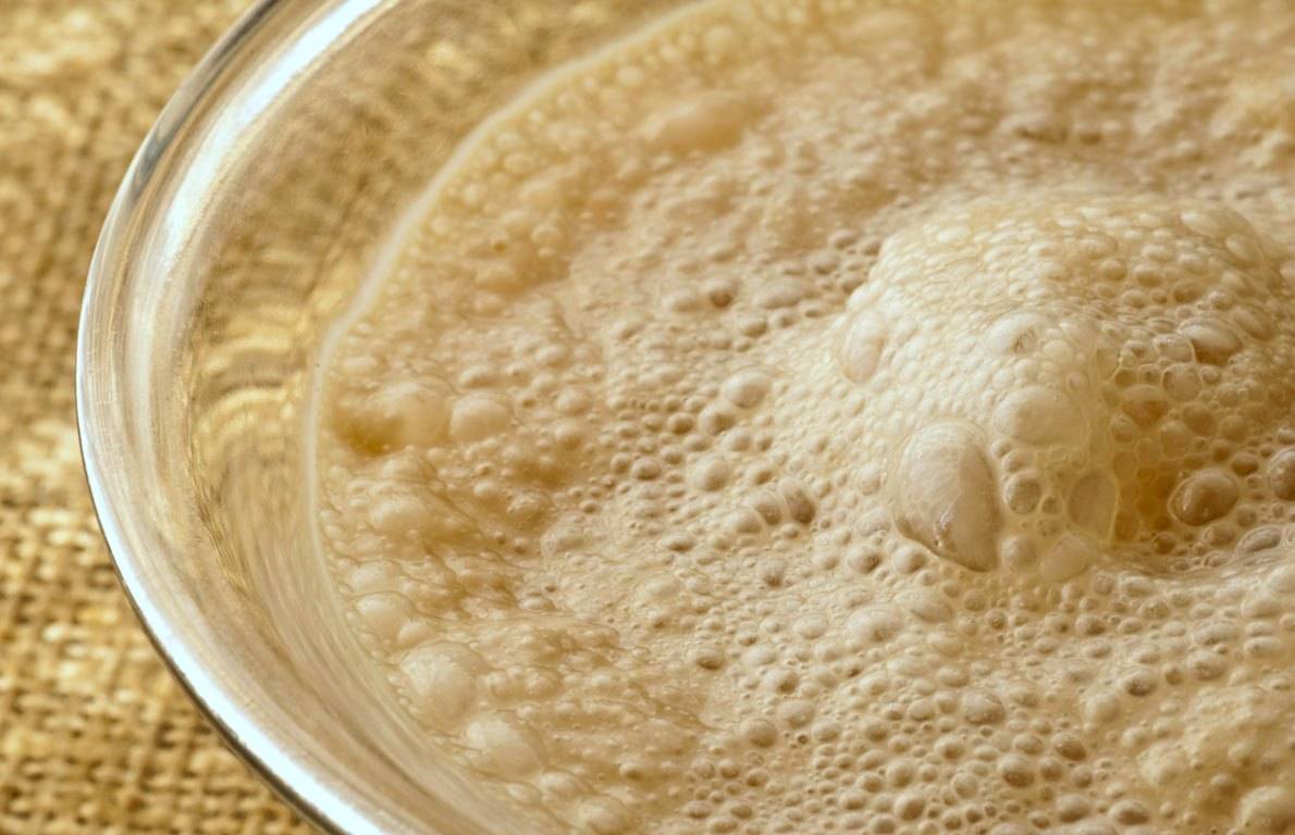 Когда дрожжевые грибы начнут работать, на поверхности появится пышная шапка из пены, поэтому заранее позаботьтесь о достаточном объеме посуды для разбраживания.