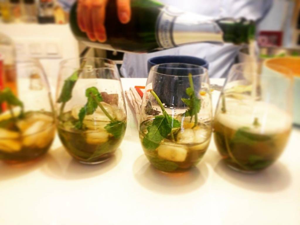 Засыпь листья мяты в стакан олд фэшн и заполни его кубиками льда. Добавь свежевыжатый яблочный сок и кальвадос, а затем долей шампанское. Перемешай.