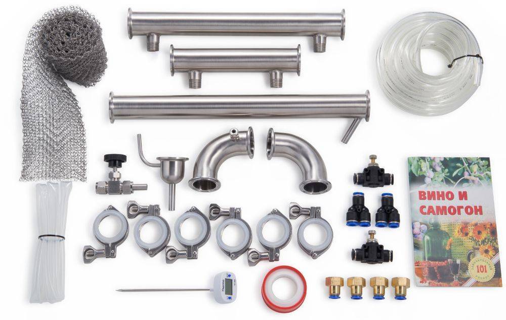 В комплекте с Бюджетычем идёт полный быстросъёмный санткомплект для подключения к воде, а также 5 пыжей Панченкова для укрепления и очистки спиртовых паров от вредных примесей.
