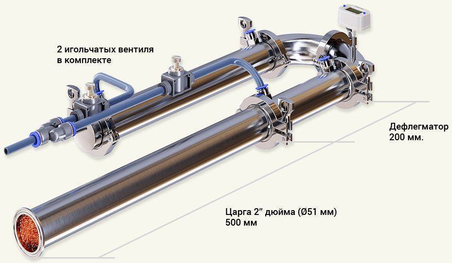 Аппарат идёт в комплекте с 1,5 или 2 дюймовой колонной. Разница в стоимости небольшая, а мощность ощутимо меняется. Если вы хотите гнать часто и много, то двухдюймовый вариант для вас будет интереснее. Во всех остальных случаях колонны 1,5 дюйма будет достаточно!