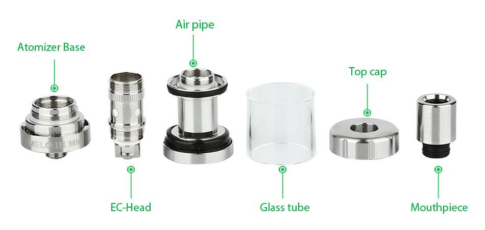 Atomizer Base — атомайзер, EC-Head — головка испарителя, Air Pipe — воздуховод, Glass Tube — стеклянная трубка, Top cap — верхняя крышка, Mouthpiece — мундштук.