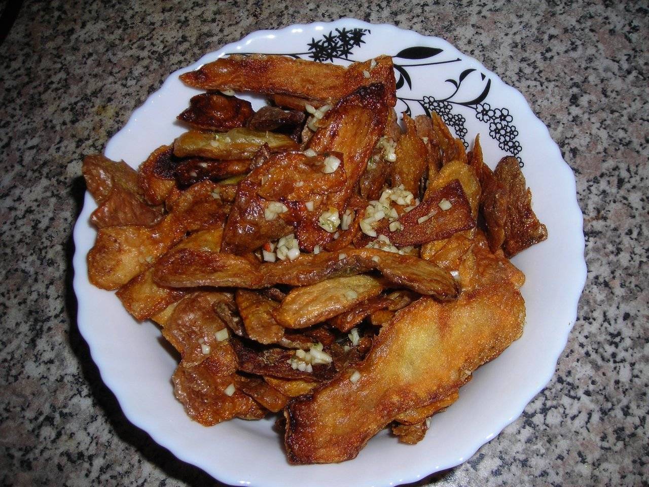 Сперва разогреваем масло (его нужно много, чтобы сделать фритюр). Закидываем в него очистки, предварительно хорошенько промыв их и избавившись от глазков. Сбавляем температуру и даем блюду минут 20-30 повариться в масле. При этом нужно зорко следить, чтобы все не сгорело.