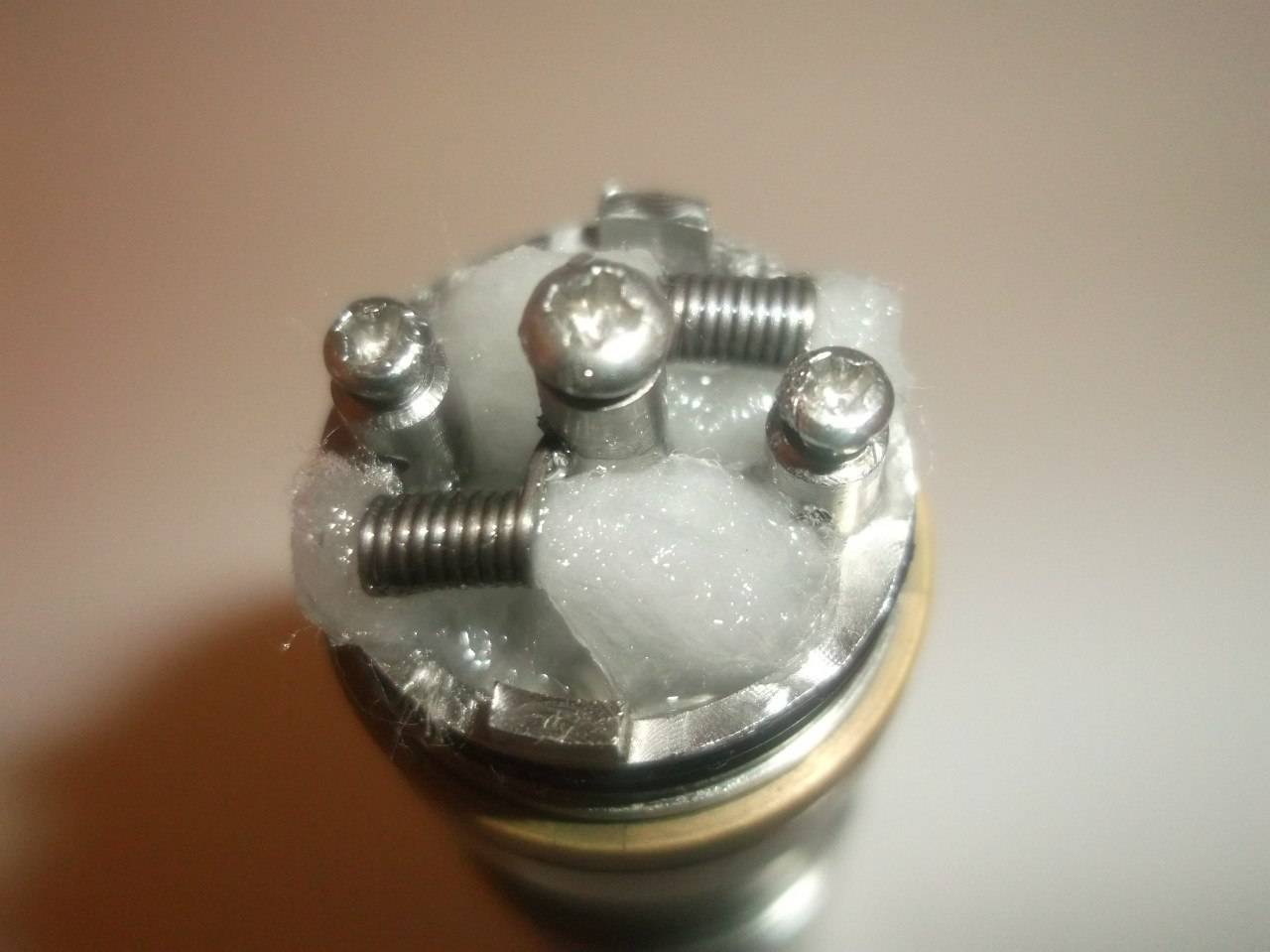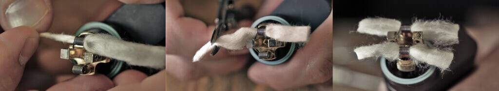 Когда вы повели эту процедуру и удостоверились, что спирали греются параллельно, установите наполнитель, пропустив его через центральное отверстие обеих спиралей. Понять сколько наполнителя нужно поможет легкое сопротивление при пропускании. Излишнюю вату обрезают, но так, чтобы оставшиеся концы соприкасались с дном дрипки, откуда будет поступать жидкость.