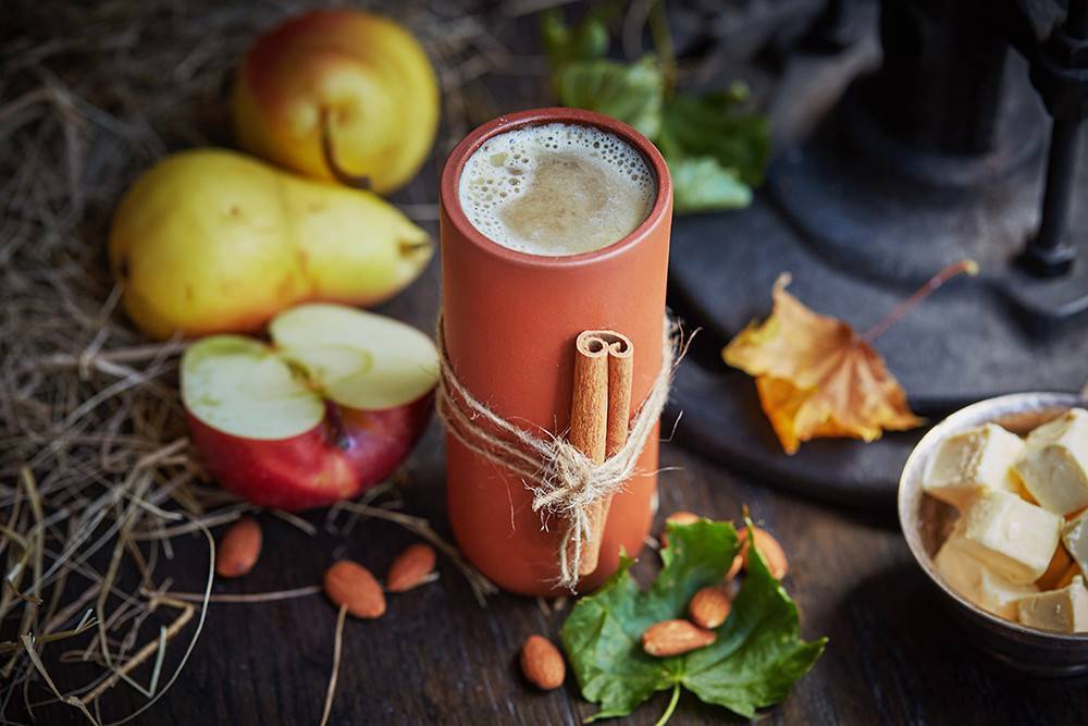Ром, лимонный фреш, Амаретто, грушевое пюре и яблочный сидр, с добавлением сливочного масла и небольшого количества сахара смешать в сотейнике и подогреть, опустив палочку корицы. Подавать горячим в глиняном стакане.