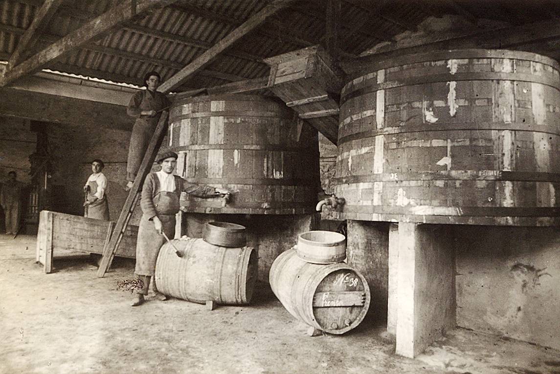 Сейчас это делают прессы, а раньше в бочке с ягодами топтались по 10-12 часов специально обученные работники, обутые в особые ботинки с шипами, между которых застревали кусочки лозы и косточки.