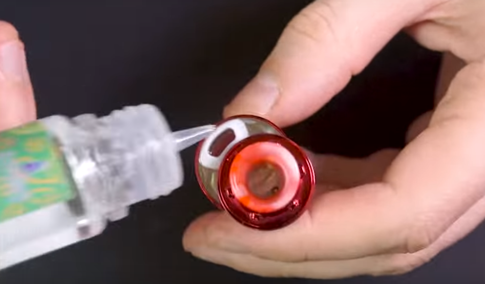 после отсоединения мундштука необходимо взять флакончик с жижей и залить ее таким образом, чтобы она стекала по стенкам, минуя центральное отверстие;