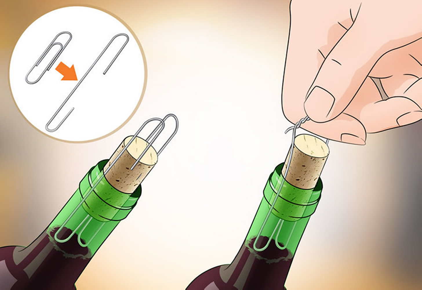 Менее популярный способ, ведь придется повозиться, – использование металлической проволоки. Может сгодиться канцелярская скрепка. Раскрутить ее нужно так, чтобы остался лишь небольшой крючок на конце. Этой стороной протолкнуть проволоку между стеклом и пробкой, крючком на конце подцепить дно закупорки. Напротив сделать то же самое другой проволокой. Сверху переплести их между собой и дернуть.