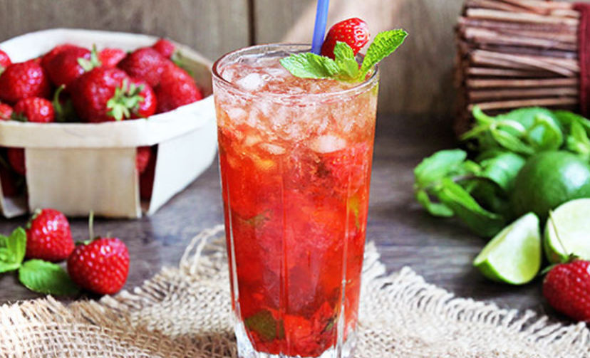 Содержимое стакана перемешивают коктейльной трубочкой, сверху украшают напиток дольками клубники и веточками мяты.