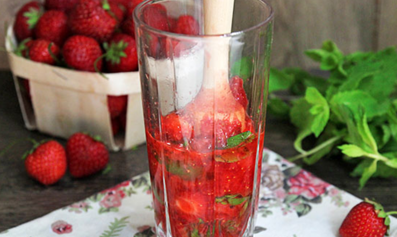 - в стакане или ступке растираем клубнику, мяту и сахар;