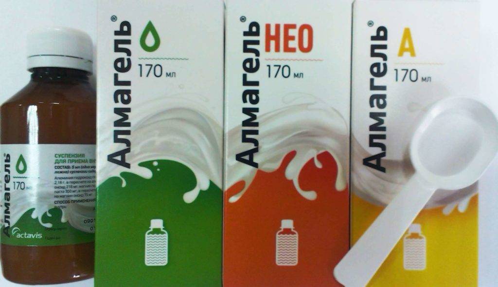 Суспензии располагаются во флаконах объемом 170 мл, вместе с мерной ложечкой они упакованы в картонные коробки. Каждый вид Альмагеля расположен в коробке соответствующего цвета: классический – в зеленой, Альмагель Нео – в красной, Альмагель А – в желтой.