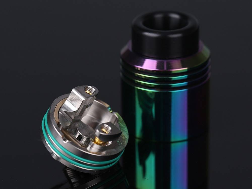 Barrage RDA это — лаконичная дрипка под одну спираль, разработанная в коллаборации межу Asmodus и обзорщиком Thesis. Главной особенностью девайса являются весьма нетривиальные отверстия обдува, скрытые между рёбрами радиатора. Несмотря на довольно компактную испарительную камеру, устройство вполне может уместить до 2 мл жидкости и это без учёта наличия пина для сквонка. Возможность регулировки затяжки отсутствует, однако, это не является проблемой учитывая специфику дрипки.