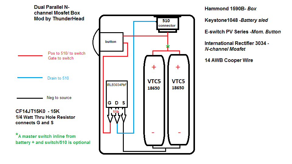 На этой картинке представлена отличная схема, на ней показано, как выглядит электронная сигарета своими руками изнутри. Главное для этого обладать проводами калибра 14 AWG Copper wire, 510-ым коннектором, мосфетом, кнопкой и отсеком для аккумуляторов. Все эти предметы можно купить в магазине радиодеталей или заказать в интернете. Самым дорогостоящим же в этой конструкции окажется покупка двух высокотоковых аккумуляторов. Вам подойдут аккумуляторы формата 18650 не менее чем 20А. Например, Sony VTC5 или хотя бы Samsung 25R.