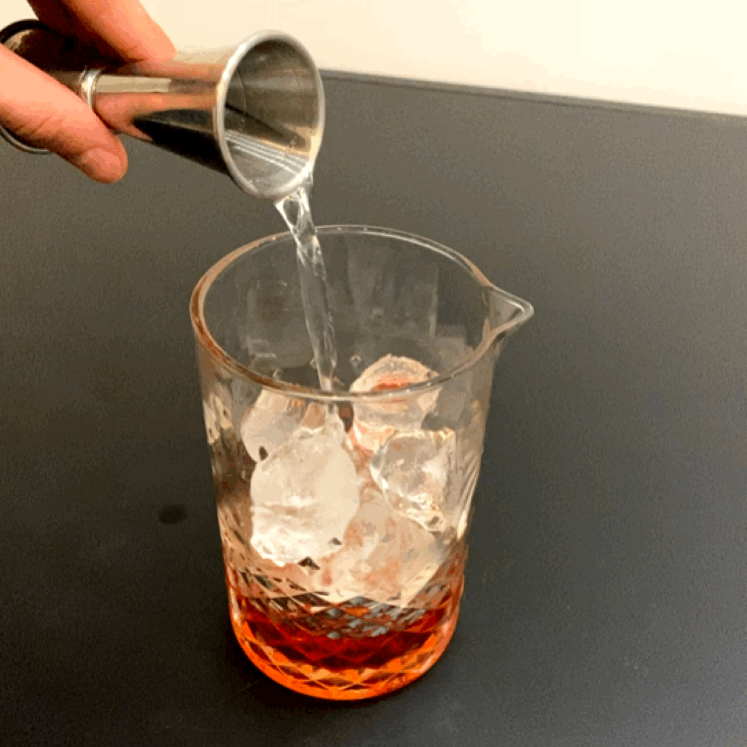 - Добавляем все ингредиенты в смесительный стакан со льдом и хорошо смешиваем на протяжении 25-30 секунд.