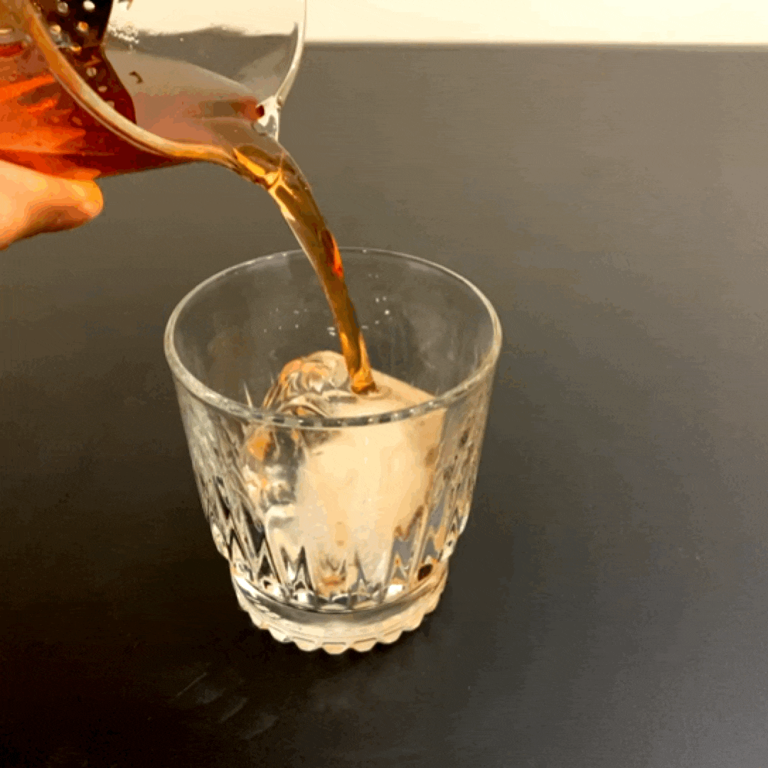 - перелить охлажденный коктейль через стрейнер в рокс;