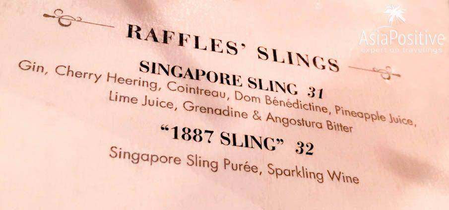 21 USD) и обладает выраженным вишнёвым цветом, опьяняющим и кисловатым вкусом. Посетители баров отеля Раффлз могут попробовать и другие вариации коктейля. Специальные дегустаторы AsiaPositive отметили, что самым вкусным коктейлем бесспорно является оригинальный Singapore Sling. Так же стоит попробовать тропический вариант знаменитого коктейля с соком маракуйя.