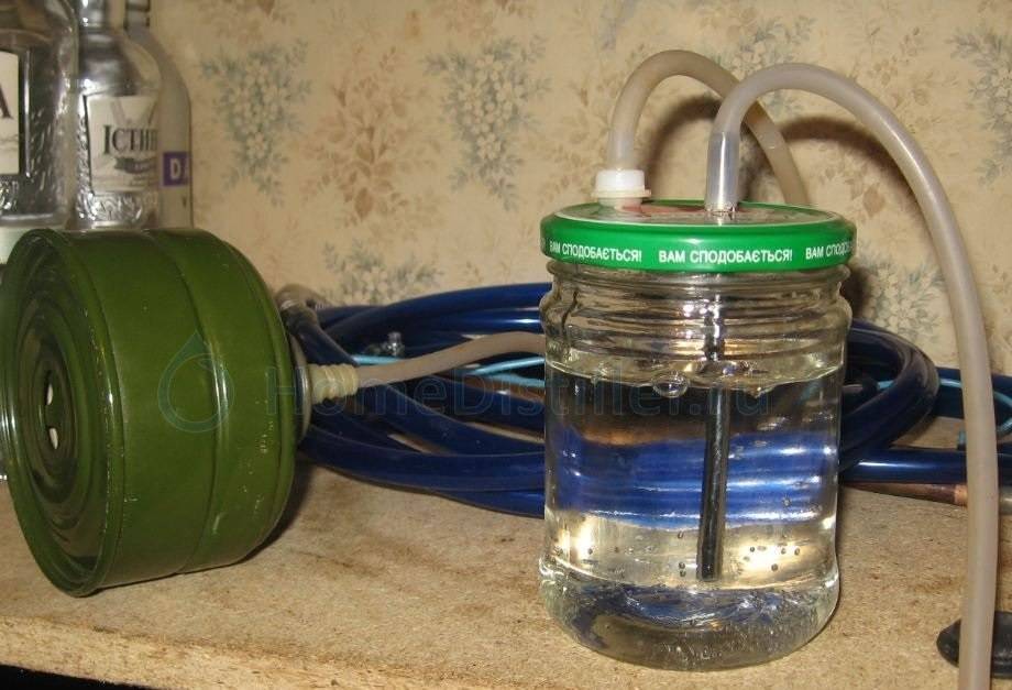 Принципиальная схема устройства во всех случаях одинакова – к выводящей газ трубке подключают фильтр. В большинстве случаев используют фильтр от противогаза, аквариумный распылитель, противогазную коробку или угольный фильтр для очистки воды. Еще можно сделать угольную колонну из цилиндра, плотно набитого активированным углем, подойдет даже аптечный.