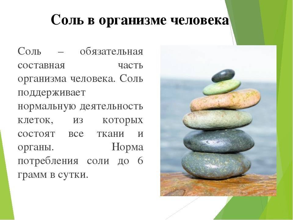 Соли регулируют водный баланс, поэтому, чем больше их в организме, тем больше скопление воды в нем. Все соляные отложения проходят через внутренние органы и выводятся через печень, почки, кишечник и кожу. Если их количество превышает допустимую норму, то отложения накапливаются в организме в виде твердых образований.