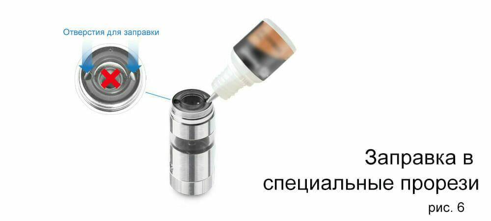 Прежде чем заправлять жидкость выключите электронную сигарету, чтобы случайно во время заправки её не включить. Заправка испарителя – верхняя. Для начала вам нужно будет снять дрип тип. Потом немного наклоните бачок, и наливайте жидкость по стеночке резервуара. Не спешите, наливать нужно до отметки 2.7 или не дальше чем торчит фитиль. Если это ваша первая заправка жидкости, то дайте ей побыть в резервуаре и впитаться в фитиль минут 5, в остальных случаях минуты 3 будет достаточно.