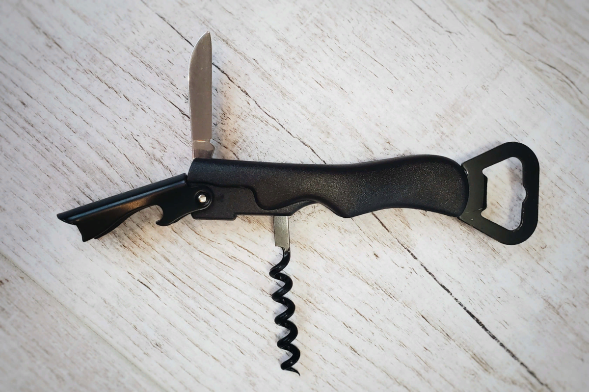 Нож официанта похож на перочинный нож, но имеет одно маленькое лезвие, с помощью которого легко снимается пластиковое кольцо на горлышке бутылки.