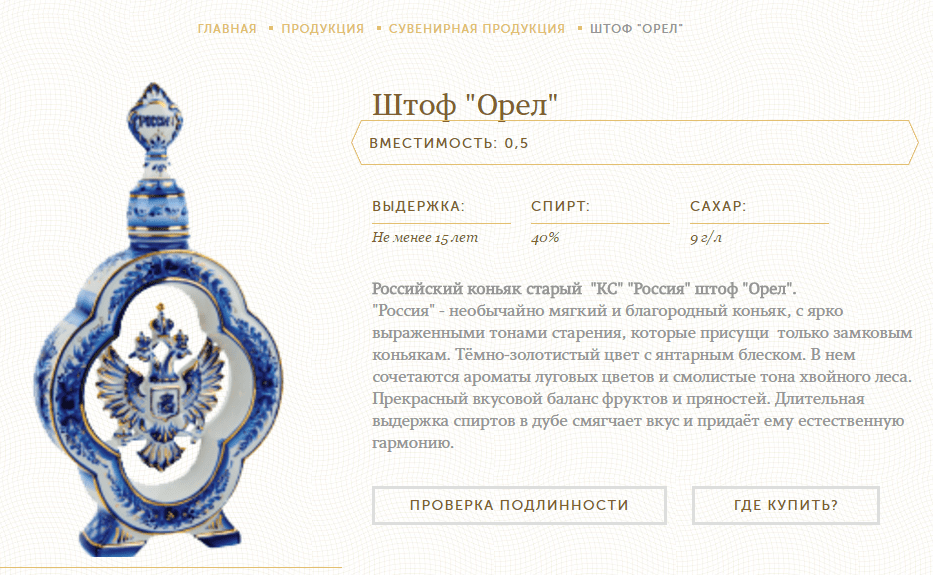 Завод ФГУП, пожалуй, один из немногих, который предлагает рынку сувенирную продукцию в фарфоре. Коньяк КС штоф «Орёл» имеет не менее 15 лет выдержки