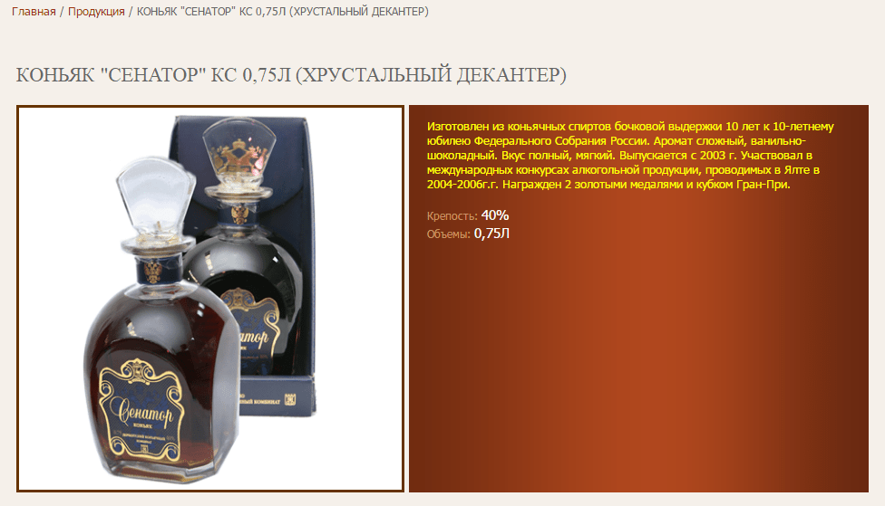 В качестве подарка от этого производителя можно предложить коньяк «Сенатор» в хрустальном декантере, который производят из коньячных спиртов дубовой выдержки более 10 лет.