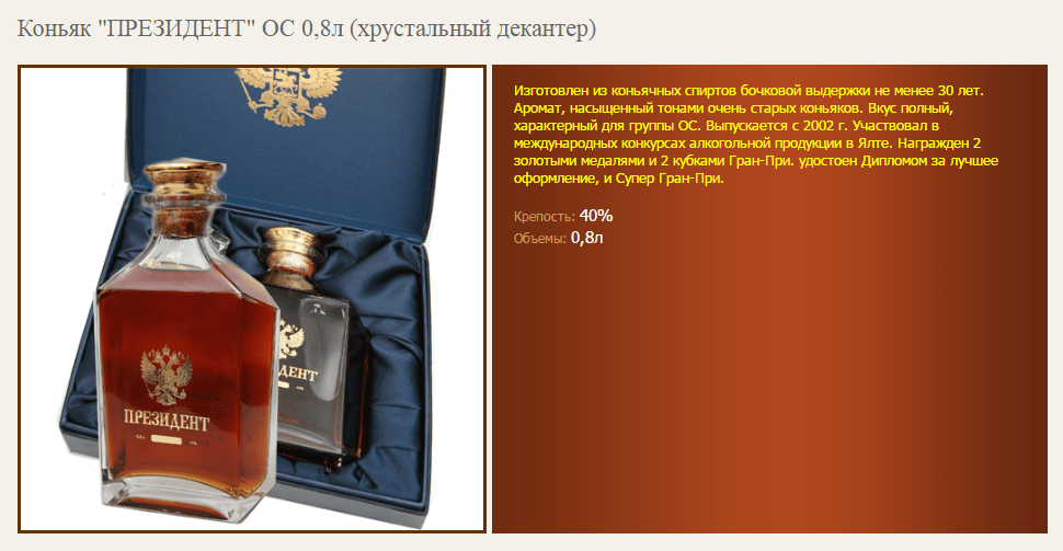 Коньяк «Президент» с 30-летней выдержкой говорит сам за себя.