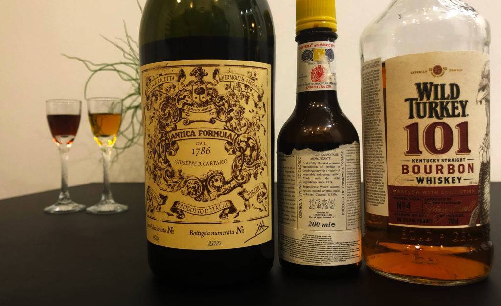 Вермут красный, сладкий, например, Cinzanno Rosso. Подойдут и другие элитные вермуты из итальянского семейства. Идеальным биттером является Ангостура.