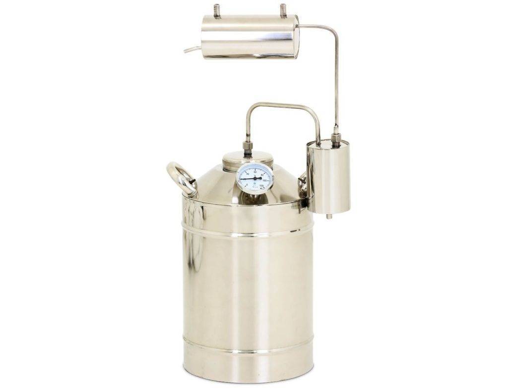 - Широкий ассортимент. Помимо разных объемов, производитель предлагает выбор между несколькими линейками: от примитивного дистиллятора из двух частей до бражной колонны с дефлегматором и царгой. Во многих моделях предусмотрен встроенный термометр.