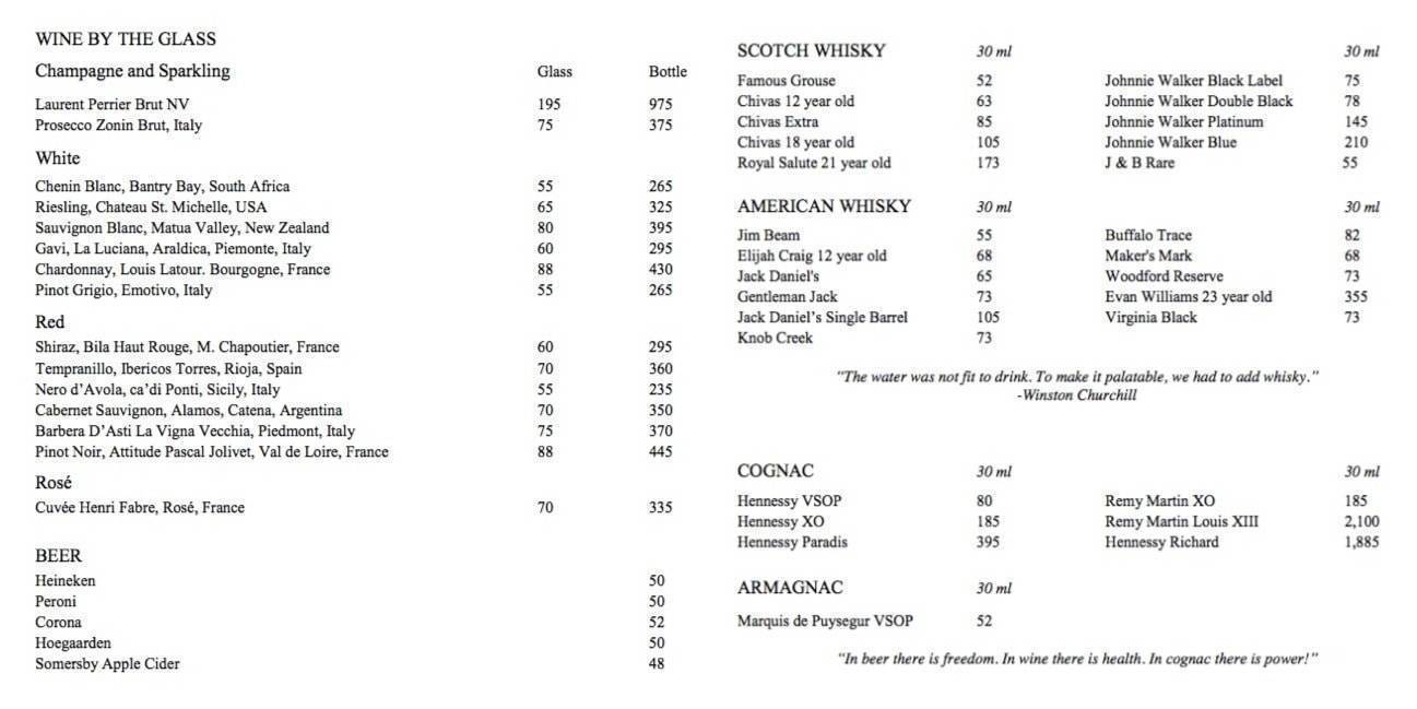 Вино, шампанское и коньяк в карте напитков бара Serafina Bar при отеле Waldorf Astoria: