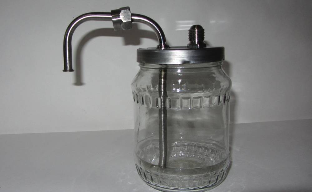 - Металлической крышки с двумя отверстиями. В оба отверстия вставлены штуцера: выходной лишь чуть «заглядывает» в банку; входной оборудован трубкой, немного не доходящей до дна банки.