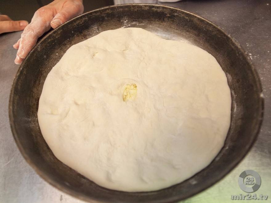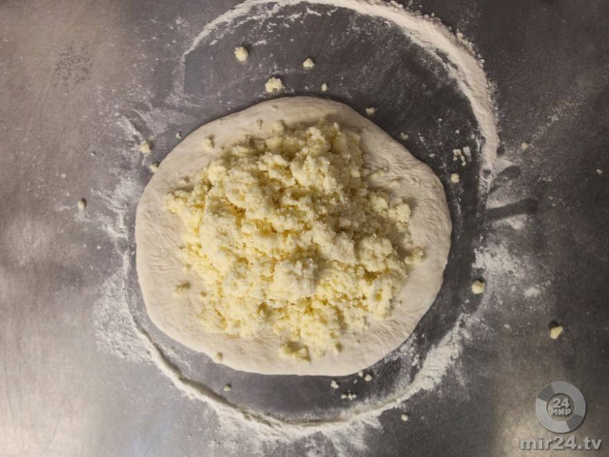 Готовое тесто раскатать в лепешки толщиной 0,5–1 см. На середину кладем сырную начинку, разравниваем ее, затем края лепешки постепенно стягиваем к центру и соединяем. Нажимом ладони разравниваем поверхность пирога и, перевернув его швом вниз, еще раз разравниваем. В результате пирог должен иметь ровную поверхность, одинаковую толщину (около 2 см) и округлую форму. Пирог укладываем на подогретый, слегка смазанный маслом противень. Делаем в центре маленькую дырочку в тесте, чтобы выходил пар.