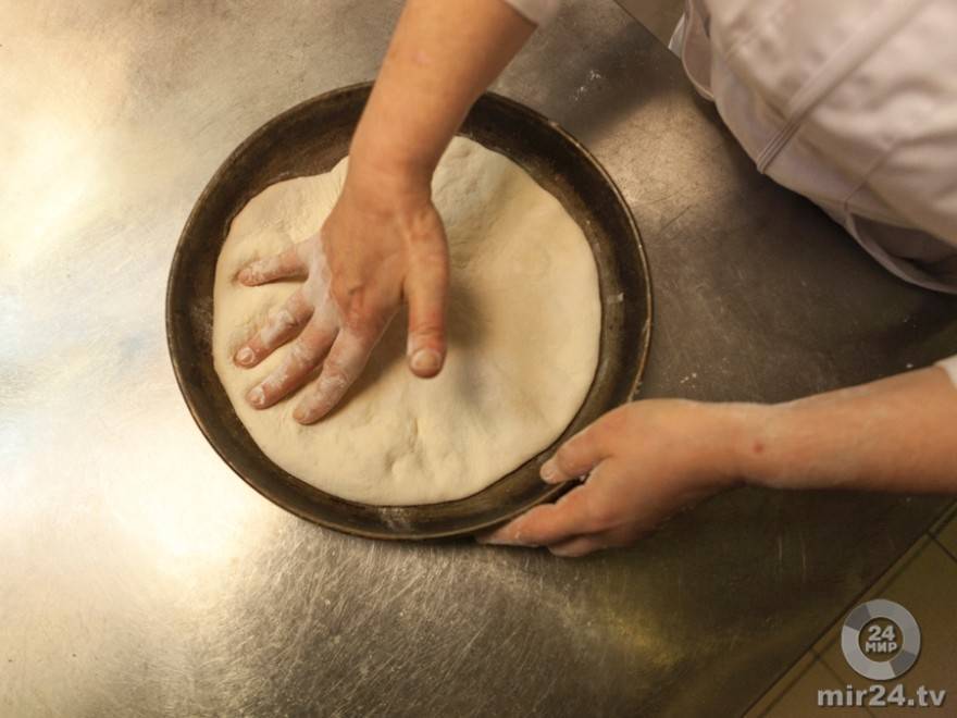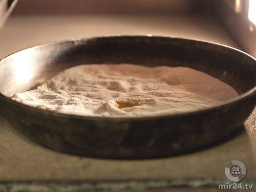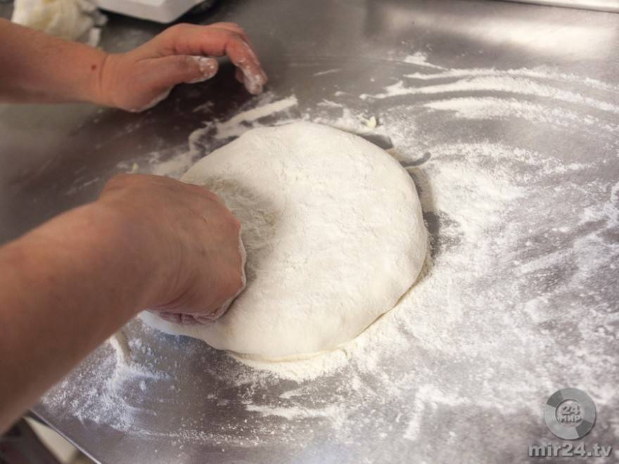 Берем один шарик теста, выкладываем его на посыпанный мукой стол. Руками формируем лепешку, примерно 20 см в диаметре, и оставляем ее отдохнуть минут на 5-10.