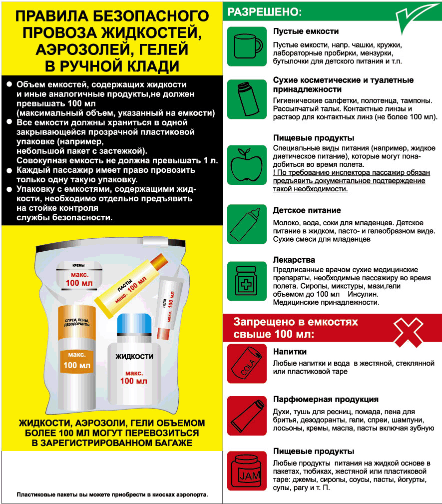 Пассажирам разрешается проносить с собой на борт самолета лишь небольшое количество перечисленных выше веществ, но только при условии, что они упакованы в емкости, объем которых не превышает 100 мл. При этом данные емкости должны быть помещены в прозрачный пластиковый пакет объемом не более 1 л, и каждому пассажиру разрешается иметь при себе в качестве ручной клади только один такой пакет. Эти пакеты можно приносить с собой из дома, но они обязательно должны быть оборудованы специальной «молнией» (см. прилагаемый постер ниже).