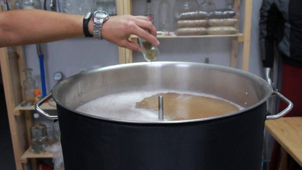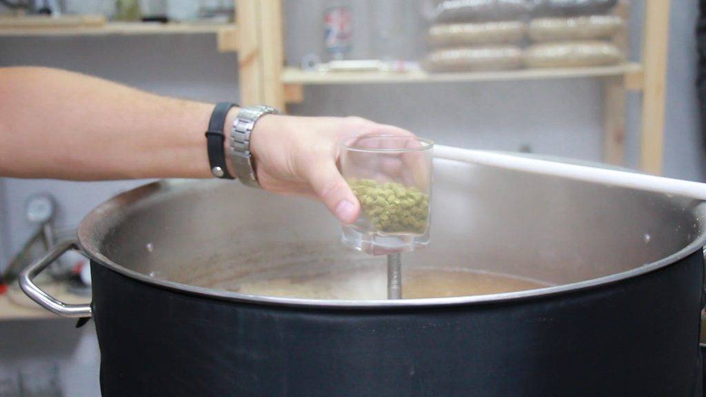 Вайцен не должен быть горьким, так что первая засыпь хмеля чисто символическая — всего 20 грамм на 60 литров сусла.