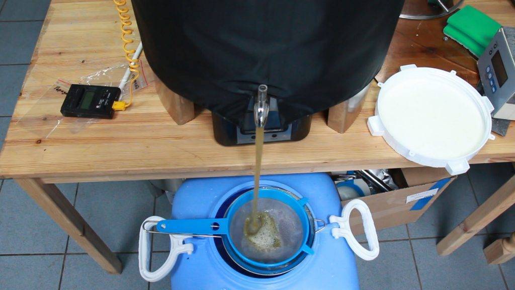 Пшеничное пиво по традиции должно быть нефильтрованным и мутноватым, поэтому мы ограничимся сливом через сито, чтобы просто отсечь крупные хлопья бруха.