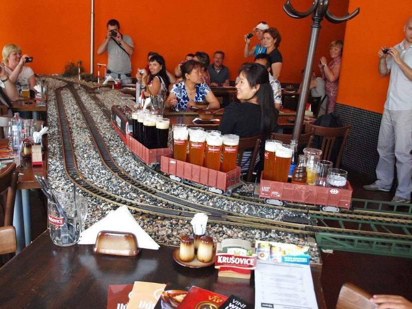 В центре города, прямо на Вацлавской площади, рядом со зданием Национального музея, расположена интереснейшая пивная-депо. Это целое шоу: по залу ездит паровозик с вагончиками и доставляет за столики напитки.