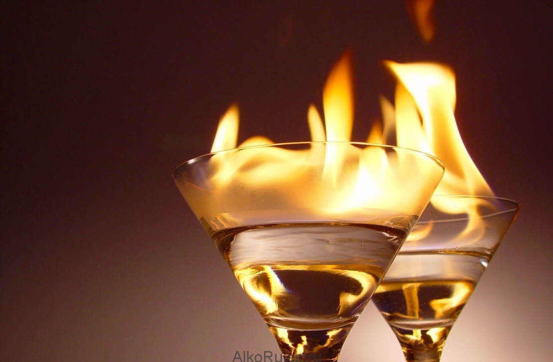 - После этого содержимое в бокале поджигают и пьют с помощью рубочки, одновременно выливая в него содержимое из двух шотов.