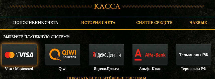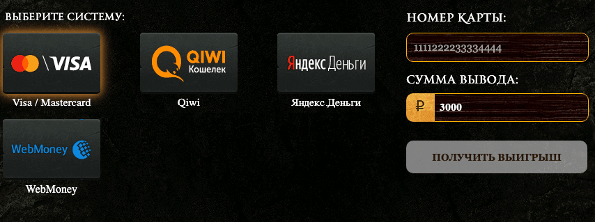 Для выплат используются аналогичные системы, но список дополняется электронным кошельком Webmoney. В отличие от депозита средств, заявки на вывод обрабатываются операторами казино, что связано с повышенными требованиями к безопасности. Среднее время денег ожидания составляет до 24 часов для электронных систем и до 3 рабочих дней для банковских карт.
