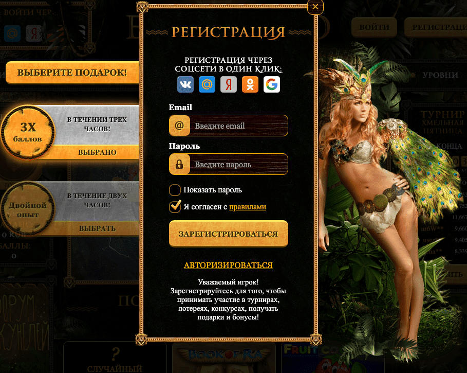 Для полноценного доступа к азартным развлечениям, а также возможности играть на деньги, использовать бонусы, акции и турниры, пользователи должны пройти регистрацию. Также это открывает доступ к программе лояльности, с помощью которой можно увеличить прибыльность от развлечений.