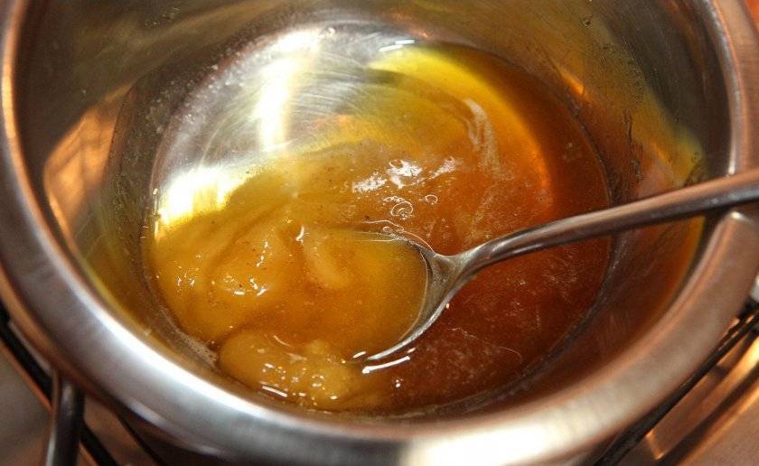 - На водяной бане прогреваем и топим мед, а потом разводим его с теплой водой, пока он полностью не растворится.