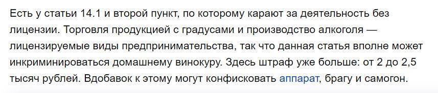 С 1999 года Уголовный и Административный кодекс Российской Федерации не предусматривает наказания за самогоноварение. Поэтому изготовление алкоголя для собственных нужд полностью легально.