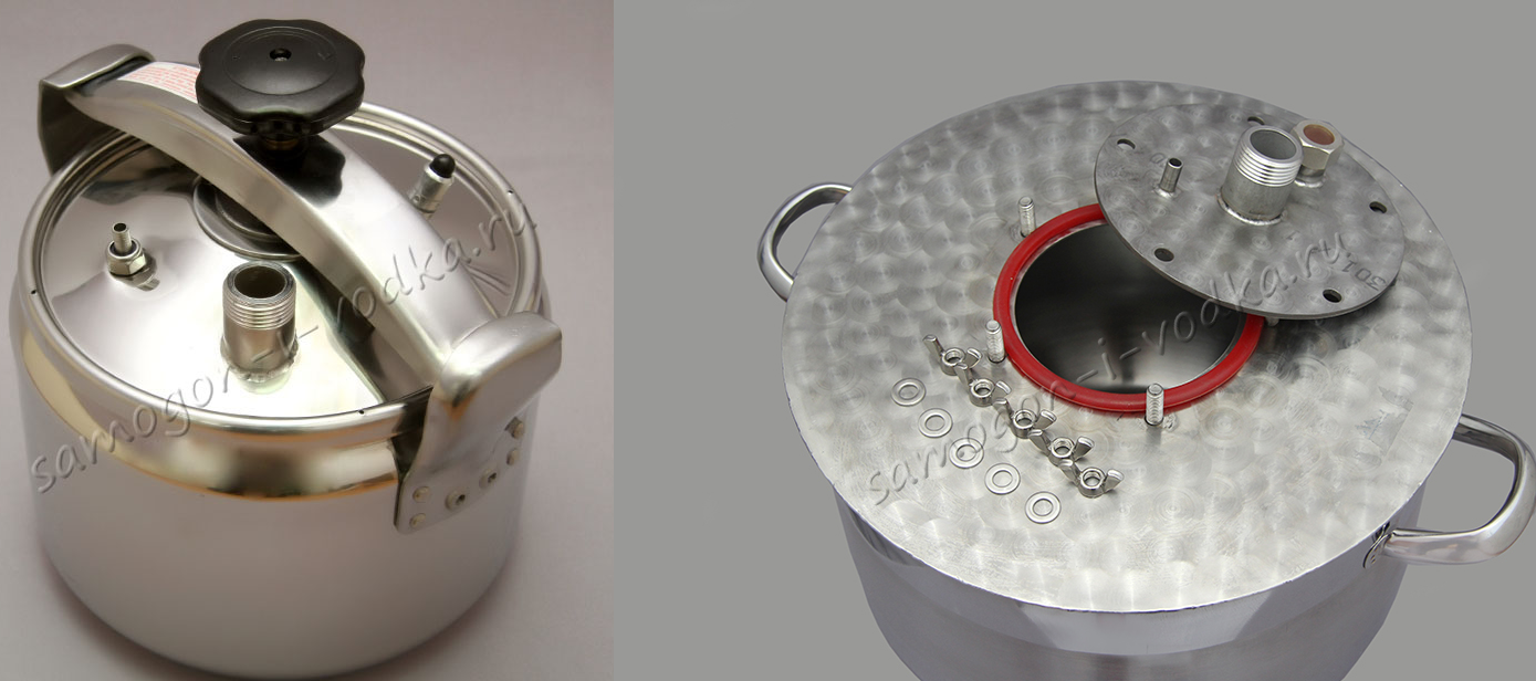 Кастрюли слегка доработаны: обварены заклепки ручек, поставлена прокладка, в крышку врезан 2-х дюймовый кламп, подрывной клапан и штуцер под термометр. Для усиления жесткости ручка крышки не срезана, а приварена к клампу. Толщина стенок 0,8 мм, кранов, тэнов, указателей уровня нет. На кламп за дополнительные деньги можно приобрести переходник с резьбой на 1 дюйм для подсоединения ХД-4.