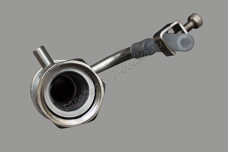 1250-й дефлегматор выполнен наклонным с охлаждающей рубашкой и внутренним возвратом флегмы. Неиспользуемые штуцеры просто глушатся силиконовыми трубками. Его применяют в основном для малых диаметров колонн – 25 и 29 мм, особенно, если нужно выиграть несколько сантиметров высоты. Да, да – всего несколько сантиметров.
